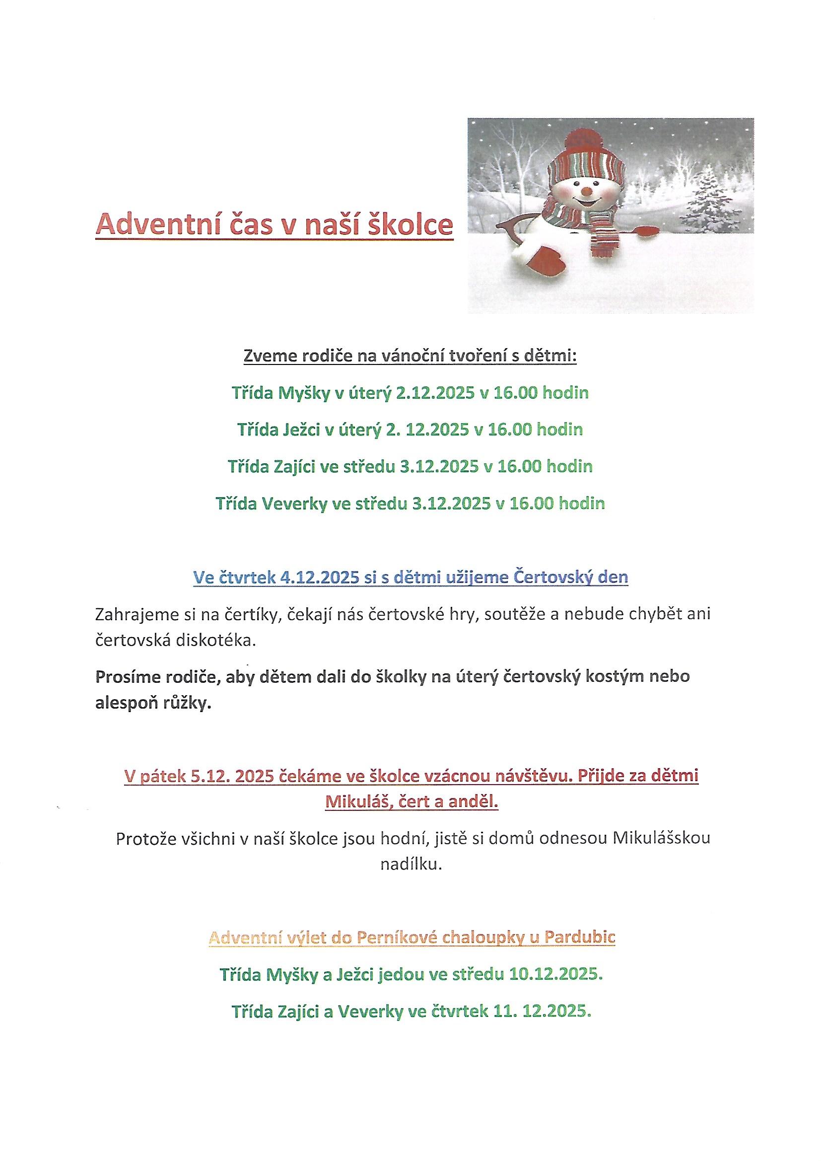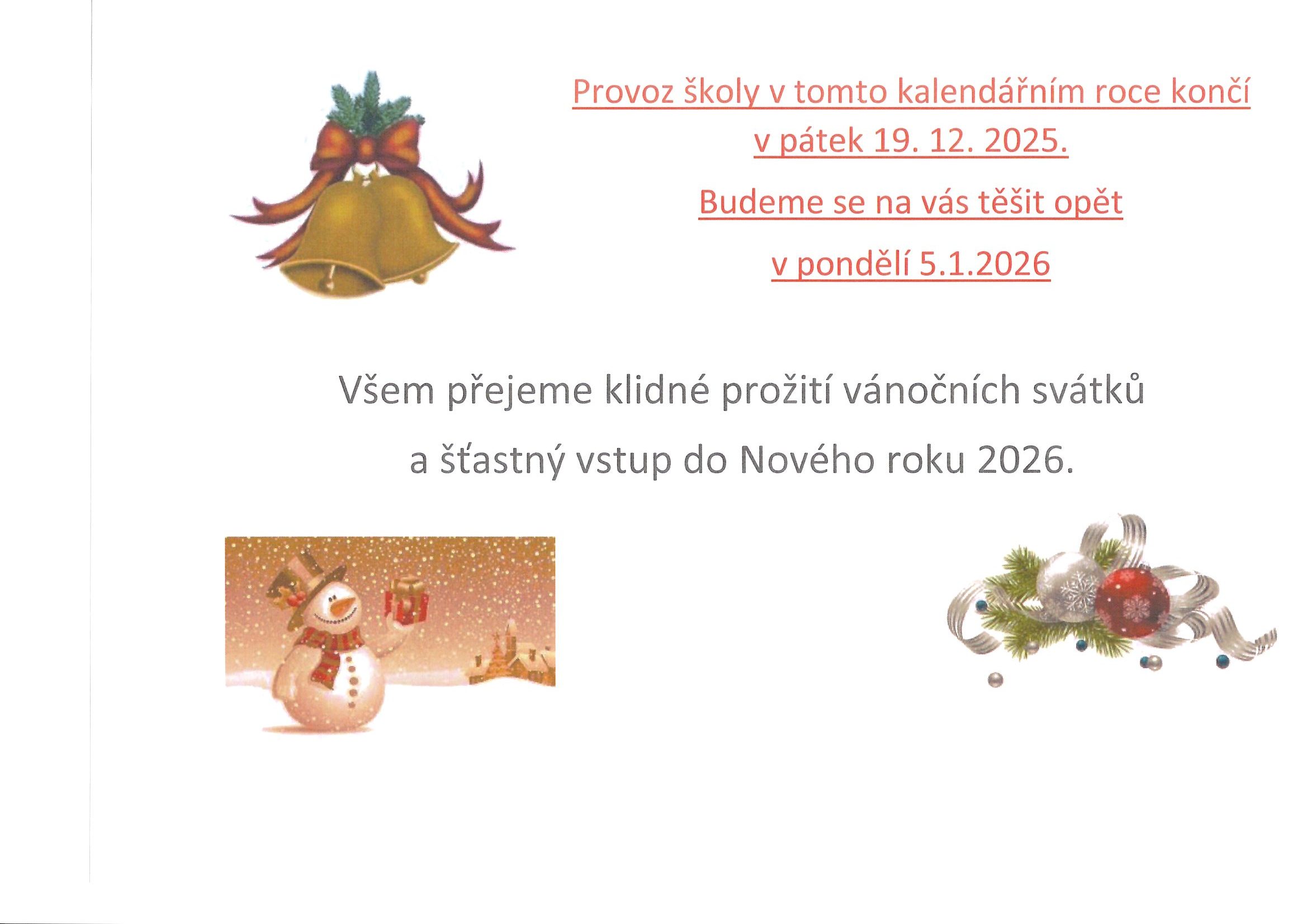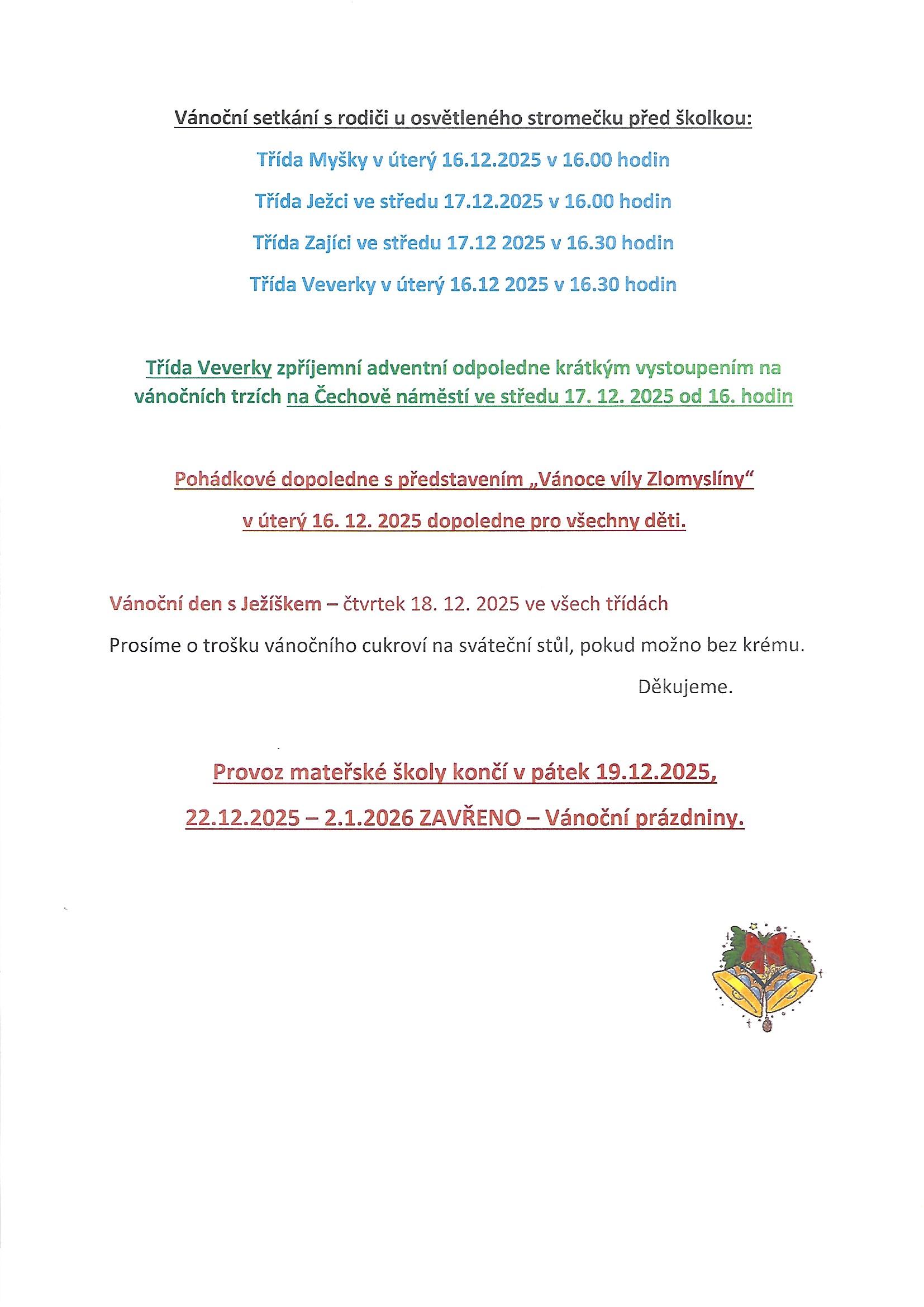 Vánoční prázdniny začínají v pondělí 22. prosince 2025 a končí v pátek 2. ledna 2026 – provoz MŠ přerušen