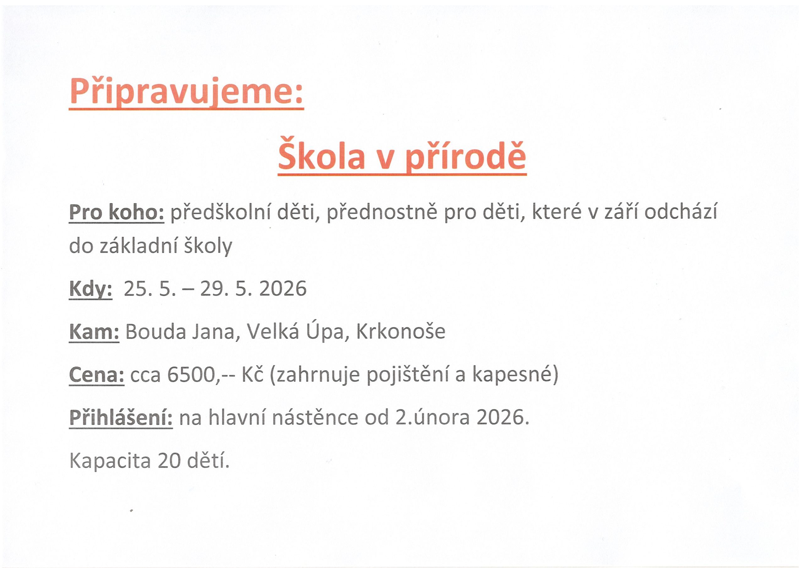 Jednodenní pololetní prázdniny připadnou na pátek 30. ledna 2026 – provoz MŠ omezen